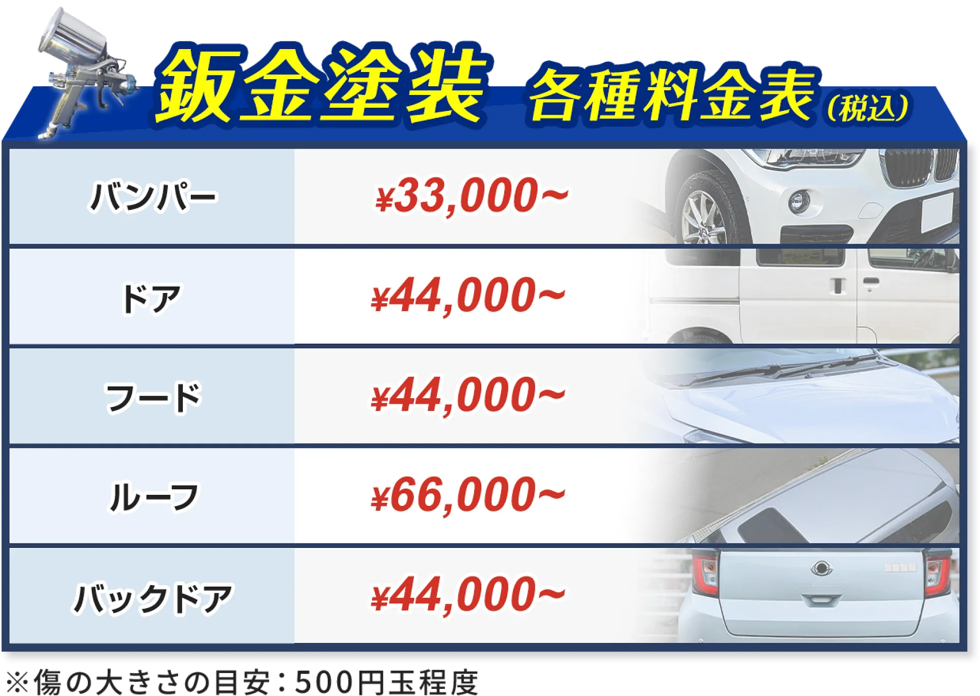 小さな擦り傷修理から事故車修理まで、傷の大小問わずどんなキズ・へこみ修理にも対応いたします。